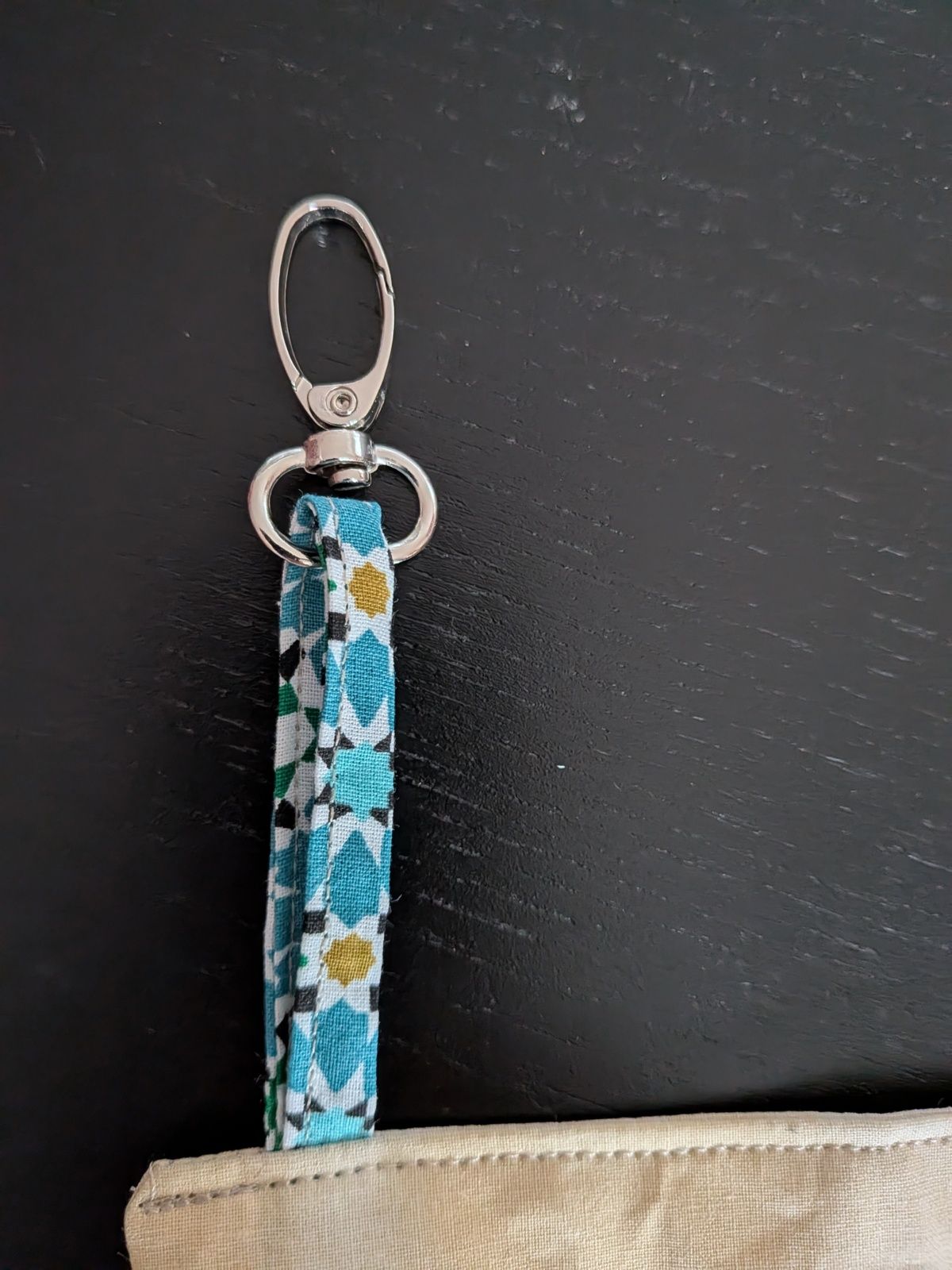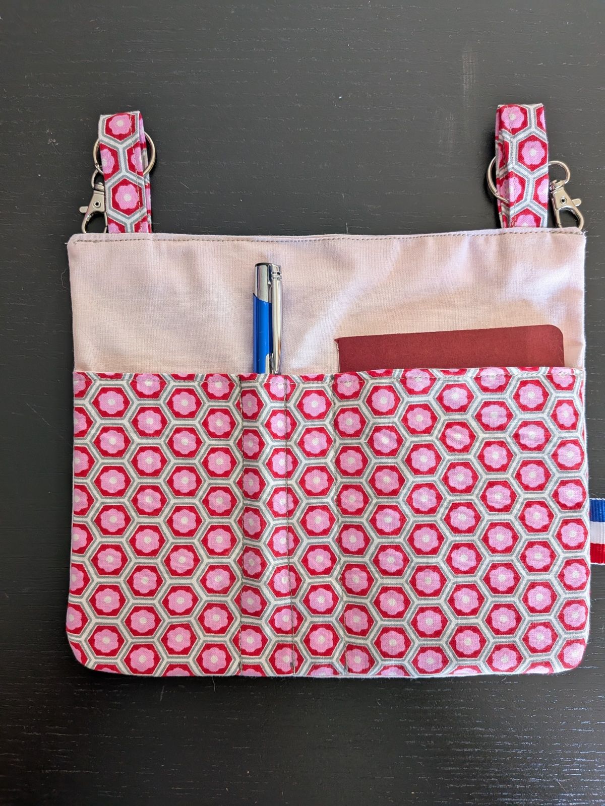 Je me suis donc concocté une petite pochette, pas trop grande, que je peux attacher aux passants du pantalon, et qui contient le minimum: un carnet, ou le téléphone, 2 stylos, et des ciseaux ou le surligneur...
